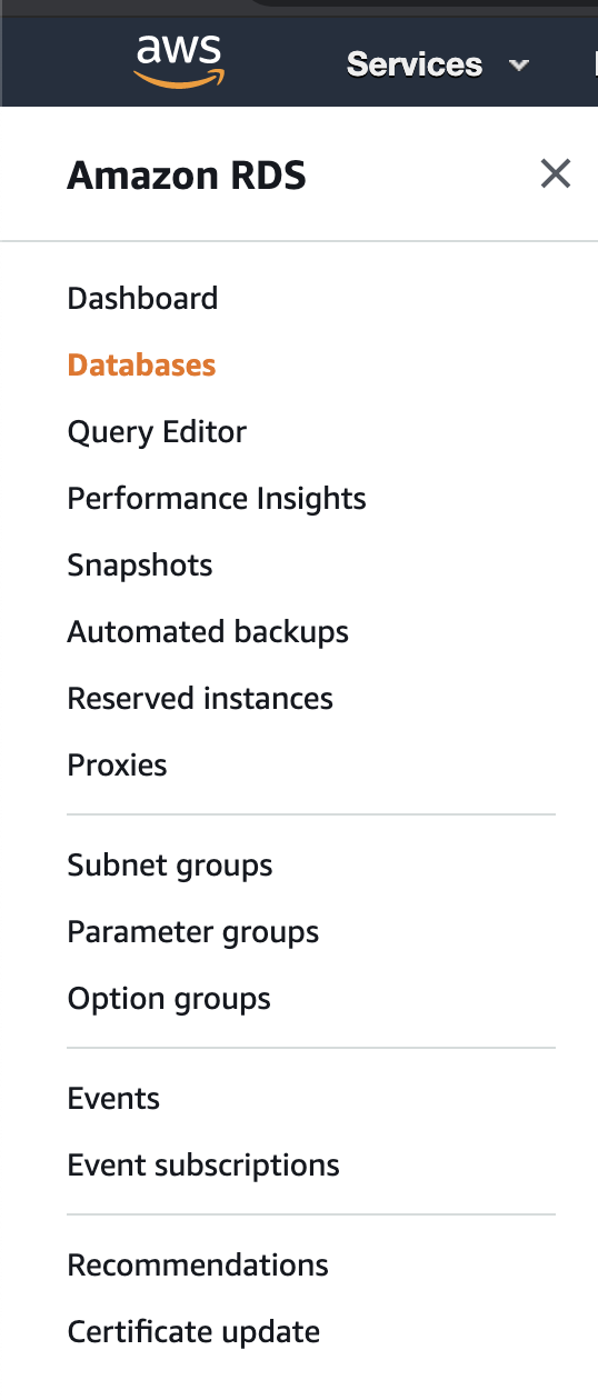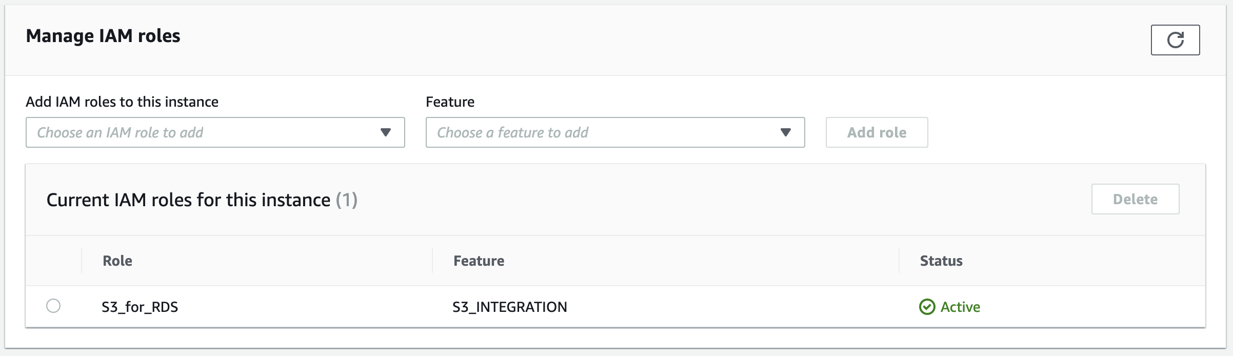 But, when I open this newly created db in the AWS console, the "Manage IAM roles" section is missing. Also the left side menu has fewer options. This is what I see: